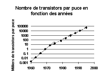 Quelqu'un s'est amusé à porté sur un graphique semi-logarithmique l'évolution du nombre de transistors sur une puce au fil des années. Ceci, comme on peut le constater ci-contre, donne deux droites qui se rejoignent au milieu des années '70; ce comportement linéaire est appelé la loi de Moore. On peut voir que depuis 20 ans, le nombre de transistors par puce est décuplé à tous les 5 ans environ. La concentration de transistors par puce a depuis 1970 été multipliée par tout près de 100 000. C'est cette amélioration constante et spectaculaire qui permet d'avoir des ordinateurs de plus en plus performants. |