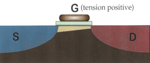 ![]() Le transistor à effet de champ (MOSFET). Au-delà d'un certain seuil, l'application d'une tension électrique à la grille fait lever la barrière électrostatique bloquant le passage des charges et permet donc au transistor de laisser passer un courant. C'est le principe qui est à la base des circuits logiques : sil y a une tension à la grille, alors il y a un courant qui passe. |